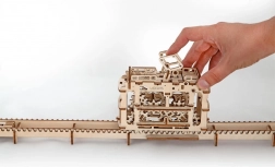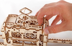 Modelul este echipat cu mecanism cu arc pentru mers înainte și înapoi, astfel încât cabina poate efectua și urcarea în pantă. Practicul spațiu de depozitare este ascuns sub fereastra de evacuare din acoperiș. Kitul este realizat din furnir de calitate, se asamblează fără adeziv și include un manual detaliat.