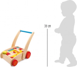 Descoperiți ajutorul ideal pentru primii pași – premergătorul din lemn cu cărucior plin de cuburi colorate. Construcția robustă din lemn masiv și placaj oferă stabilitate, în timp ce cuburile din fag de diverse forme (cca 5–10 cm) invită la joacă creativă. Datorită mânerului confortabil la înălțimea de 39 cm, copiii se simt încrezători și în siguranță.