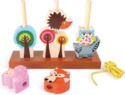 Acest set din lemn de înaltă calitate îmbină stivuirea și înșirarea într-un singur joc isteț. Copiii pot așeza ariciul, vulpea, veverița, ratonul și bufnița pe suportul cu trei pini sau îi pot înșira pe șnurul inclus. Piesele sunt robuste, se potrivesc bine în mâna copilului și, prin culorile lor, stimulează imaginația.
