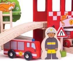 Această cale ferată din lemn cu tematica stației de pompieri transformă orice cameră într-un centru de salvare. Copiii pot trece prin tunelul remizei de pompieri, pot concura cu autospeciala, pot trimite trenul de salvare cu vagoane detașabile și îi pot ajuta pe pompieri cu scara sau hidrantul. Datorită detaliilor bogate și construcției robuste, jucăria dezvoltă excelent imaginația și îi învață pe copii să rezolve situații.