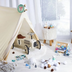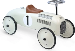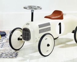 Premergătorul stilat pentru copii, cu aspect de mașină de curse, impresionează prin farmecul retro și construcția metalică de calitate. Oferă deplasare silențioasă datorită roților cauciucate, manevrare ușoară cu volan și structură solidă cu capacitate de 20 kg – ideal pentru micii piloți de la 1,5 ani.
