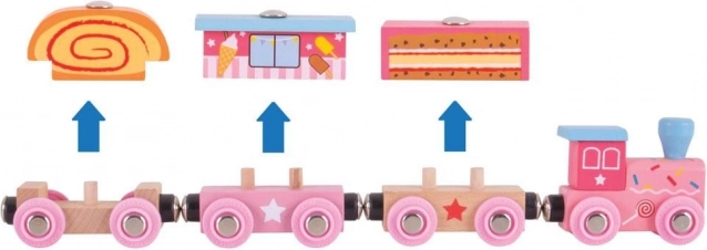 Un trenulet drăguț din lemn în nuanțe de roz îi va încânta pe toți micii mecanici. Setul include o locomotivă și trei vagoane realizate cu detalii fine, cu cuplare magnetică, este pe deplin compatibil cu majoritatea căilor ferate din lemn, iar în pachet găsiți în plus 3 bucăți de șine pentru extinderea traseului.