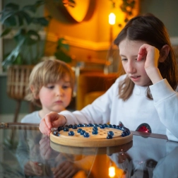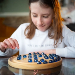 Tabla circulară din lemn fin și bilele lucioase din sticlă oferă o senzație plăcută la joc și o durată lungă de viață.