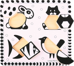 Descoperă primul puzzle pentru cei mici – puzzle de inserare din lemn de calitate, în contrast alb-negru. Culorile contrastante sunt ușor percepute de copii, astfel încât jocul susține excelent primele percepții. Piesele mari și robuste sunt ușor de apucat, dezvoltă motricitatea fină, abilitățile senzoriale și concentrarea. Fabricat din lemn obținut responsabil, respectă normele europene de siguranță.