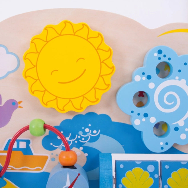 Această tablă activă din lemn, cu tematică marină, oferă copiilor o paletă variată de activități: labirint rotativ, căluți de mare care se rotesc, peștișori glisanți și sârmă cu mărgele cu pescăruși. Fiecare element este conceput pentru a sprijini dezvoltarea naturală a abilităților, a răbdării și a concentrării. Datorită prinderilor ajustabile, tabla poate fi fixată în siguranță și de pătuț, oferind bebelușului stimulare la îndemână.