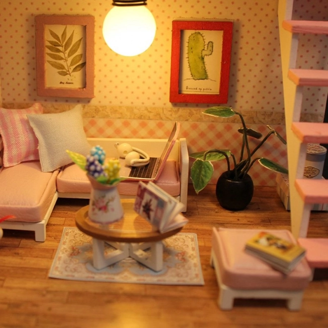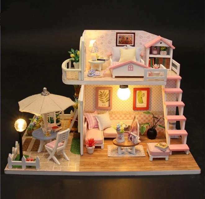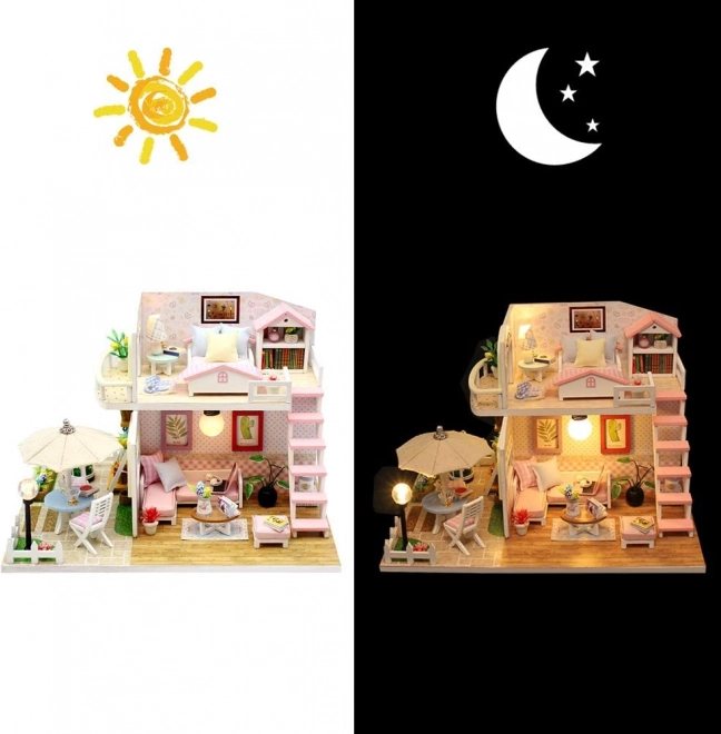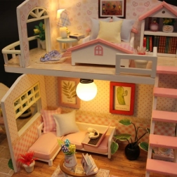 Căsuță din lemn pentru păpuși, elegantă, cu două etaje, de asamblat, cu iluminare LED. Mini-mobilierul și accesoriile realizate cu precizie asigură distracție pentru ore îndelungate, iar după finalizare devine o decorațiune stilată pentru camera copilului. Bateriile nu sunt incluse.