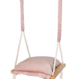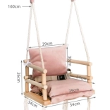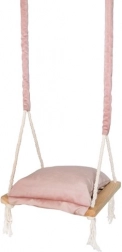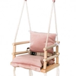 Leagăn stilat pentru copii de la 12 luni, cu perne moi din materialul CLEANABOO, care nu absoarbe lichidele. Construcție sigură din lemn, cu margini rotunjite, frânghii rezistente și centură de siguranță pentru legănare confortabilă și liniștită acasă.