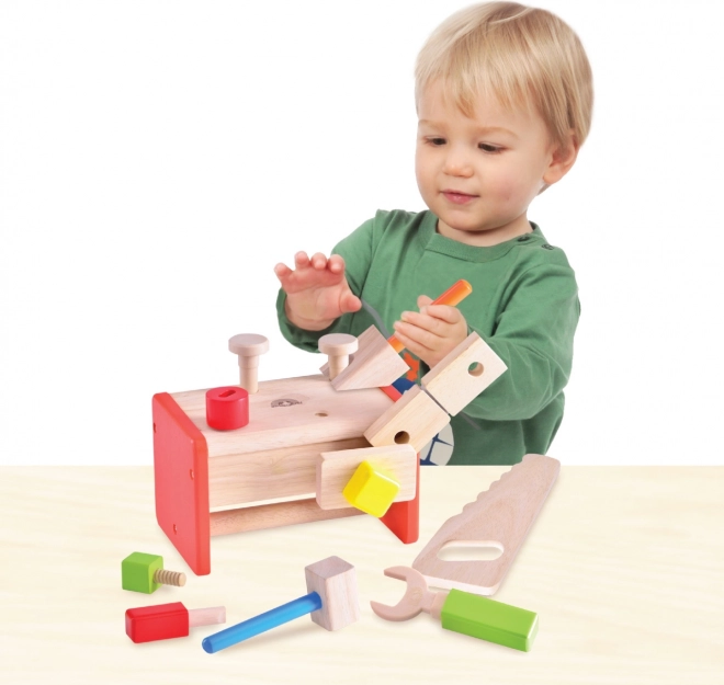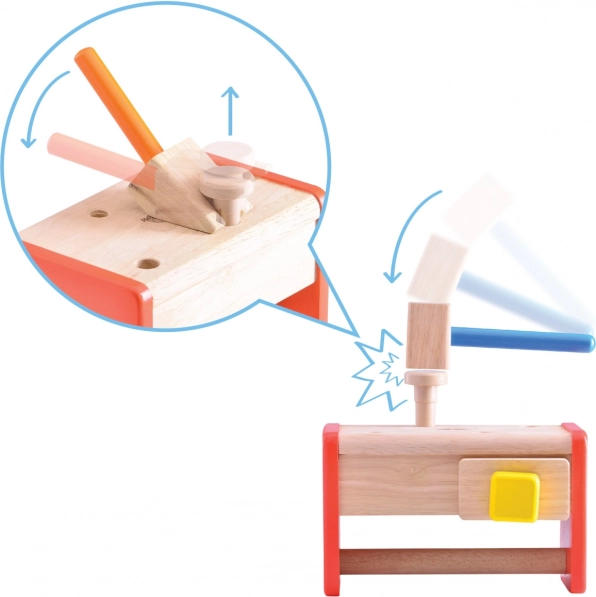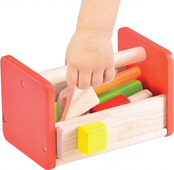 Setul este realizat din lemn masiv rezistent și lemn-plastic, garantând durabilitate și siguranță în timpul jocului. Combinația atrăgătoare dintre aspectul natural și culorile intense va captiva privirea fiecărui copil. Copiii învață să sorteze uneltele după scop, iar datorită construcției compacte, setul economisește și spațiu.