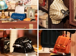Mașină de scris, panou cu indicii, telefon și pălărie – fiecare miniatură recreează atmosfera unei agenții britanice de detectivi.