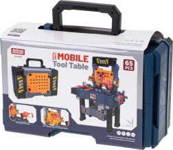 Această geantă portabilă se desface ușor într-o măsuță de lucru pentru copii cu multe spații de depozitare – de la lada inferioară pentru piese mai mari, la panoul perforat pentru unelte, până la două rafturi și un blat spațios. Copiii învață bazele bricolajului și pot încerca în siguranță activități precum „înșurubare”, „bătut cuie” sau „tăiere”.