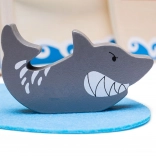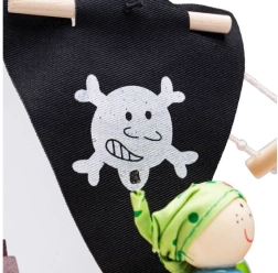 Acest set de vapor pirat din lemn include tot ce au nevoie micii pirați pentru aventurile lor. Ambalajul include un căpitan, doi pirați, un vapor, o ancoră, un cufăr cu comori și un rechin. Toate elementele de joc pot fi plasate practic în vapor, fiind astfel ideal pentru călătorii și transport ușor.