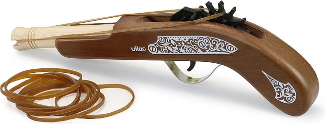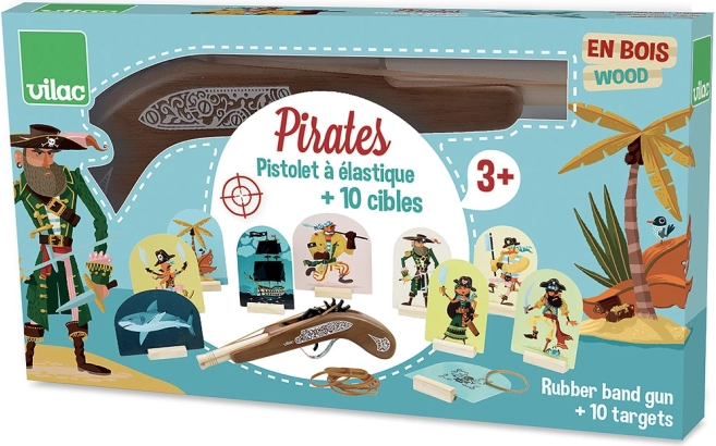 Pistol de lemn pirat de la marca Vilac este jucăria ideală pentru micii entuziaști ai aventurilor de pirat. Permite copiilor să exerseze țintirea cu ajutorul elasticelor sigure, care sunt incluse în pachet.