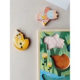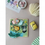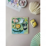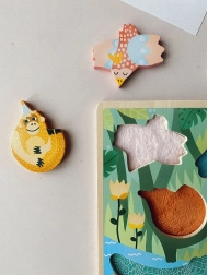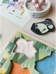 Designul semnat de Michelle Carlslund, în culori pastelate delicate, oferă jucăriei un aspect atrăgător și stimulează imaginația. Baza din lemn cu decupaje și motive de animale îi învață pe copii să potrivească forme, să recunoască culori și animale. Puzzle-ul este durabil, sigur și realizat din lemn de calitate, în combinație cu materiale textile.