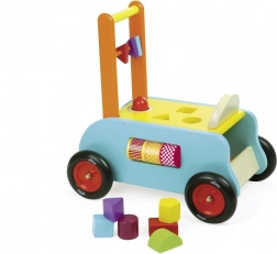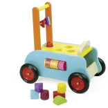 Acest cărucior multifuncțional din lemn 3‑în‑1 este un partener grozav pentru copiii de la 12 luni. Ca premergător ajută la primii pași, ca ride-on/împingător consolidează stabilitatea și coordonarea, iar ca sortator de forme dezvoltă gândirea logică și motricitatea fină. Construcția robustă din lemn și roțile mari din cauciuc asigură siguranță și o deplasare lină în interior și pe suprafețe netede.