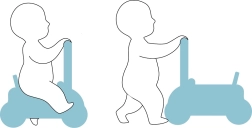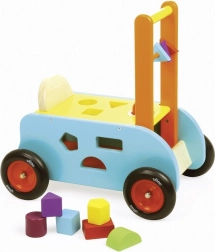Pe laterale găsești decupaje pentru introducerea formelor din lemn, pe partea stângă role colorate rotative, iar sub spătar triunghiuri colorate rotative. Suprafața șezutului este echipată cu un claxon cu efecte sonore, care îi distrează pe copii și îi motivează să descopere mai mult. Datorită înălțimii mici a șezutului, căruciorul este confortabil și pentru copiii mai mici.
