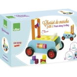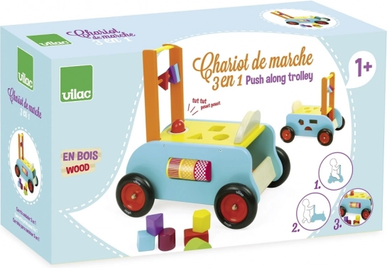 Căruciorul din lemn stilat de la VILAC îmbină funcțiile de premergător, ride-on/împingător și sortator de forme. Datorită construcției stabile, roților mari din cauciuc și șezutului confortabil cu un mic spătar, este ideal atât pentru primii pași, cât și pentru mersul pe săniuță. Elemente rotative colorate, introducerea formelor și claxonul cu efecte sonore dezvoltă motricitatea, percepția senzorială și orientarea spațială a copiilor.