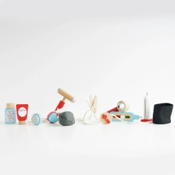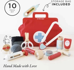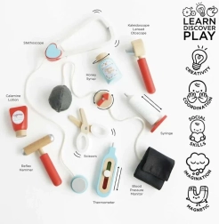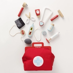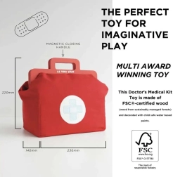 Această geantă de doctor cu design din colecția Honeybake de la LE TOY VAN este o bază excelentă pentru jocurile de rol. Geanta textilă vintage, cu fund întărit și mânere din lemn, ascunde 10 accesorii atent realizate, care le permit copiilor să imite examinările medicale reale. Sunt incluse și fișe tipăribile cu „rețetă medicală” pentru o experiență și mai realistă.