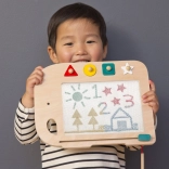 Această tablă de desen magnetică din lemn, de înaltă calitate, oferă copiilor posibilități nelimitate de creativitate. Datorită suprafeței mari cu patru culori vii iau naștere desene, modele și forme ingenioase. Creionul prins ferm cu un șnur nu se pierde, iar cele patru ștampile magnetice (triunghi, cerc, pătrat, stea) rămân la locul lor datorită magnetizării.