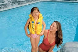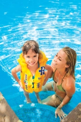 Vesta de înot pentru copii INTEX este instrumentul ideal pentru copiii de la vârsta de 3 ani care învață să înoate. Datorită designului său viu colorat, asigură vizibilitate perfectă a copiilor dumneavoastră pe apă, permițând astfel părinților să urmărească ușor mișcările și jocurile lor în piscină, lac sau mare.