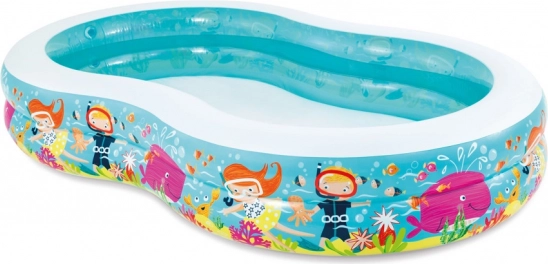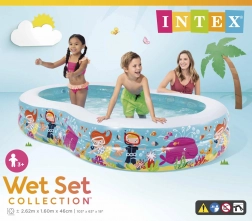 Conținutul pachetului include piscina gonflabilă, setul de reparații și ambalaj colorat.