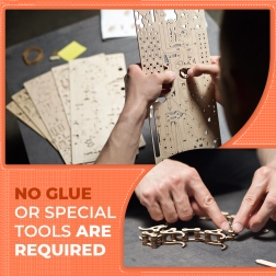 Această pistă de bile elaborată, din placaj de calitate, îmbină plăcerea modelismului, valoarea educativă și un spectacol relaxant. Liftul cu lanț acționat manual transportă lin bilele la start, de unde pornesc pe trei secțiuni separate, fiecare cu un obstacol principal unic. Designul deschis evidențiază mecanica funcțională și detaliile fine.