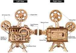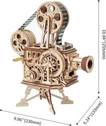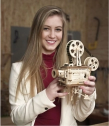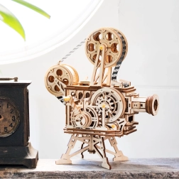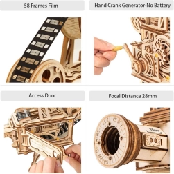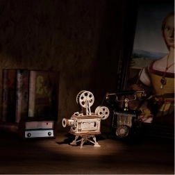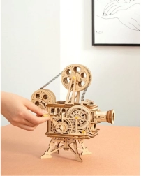 Acest model de proiector din lemn, cu stil retro, impresionează prin angrenaje elaborate, bobine și detalii autentice. Asamblați mecanismul pas cu pas, introduceți banda de film inclusă și bucurați-vă de mini-cinema la tine acasă. Datorită generatorului manual nu aveți nevoie de baterii – este suficient să rotiți manivela și proiecția poate începe.