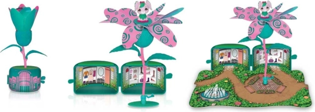 După deschidere veți descoperi o scenă de joc miniaturală – imagini ca dintr-o căsuță și o suprafață de joc sub forma unei grădinuțe, care stimulează imaginația și motricitatea fină.