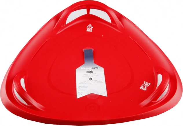 Farfuria de săniuș METEOR, în culoarea roșie, îmbină perfect simplitatea și viteza. Noul design triunghiular îmbunătățește stabilitatea și permite o poziție confortabilă chiar și pentru adulți. Datorită dimensiunilor compacte, se transportă ușor și este gata oricând pentru o coborâre pe derdeluș.