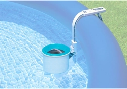 Skimmerul INTEX 28000 curăță fiabil suprafața și menține apa limpede. Prin introducerea tabletelor chimice în coș se asigură dozare sigură și uniformă. Brațul reglabil se adaptează ușor la marginea piscinei, iar coșul cu inserție capturează eficient impuritățile.