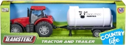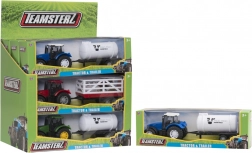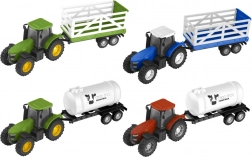 Alegeți tractorul în verde, albastru sau roșu și atașați remorca dorită – platformă universală sau o cisternă elegantă pentru lapte (în funcție de disponibilitate).