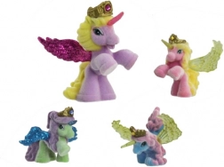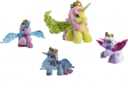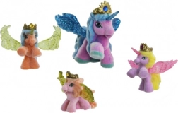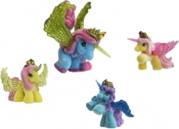 Fiecare ponei are aripi cu sclipici, un corn magic și o coroană aurie cu „cristal” colorat – ideal pentru jocuri de basm.