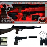 Setul de poliție Top Secret include un pistol de poliție din metal, amortizor, binoclu, legitimație de poliție și pușcă de poliție. Toate sunt fabricate din metal. Toate funcționează cu capse – 8 lovituri. Fabricat în Spania.