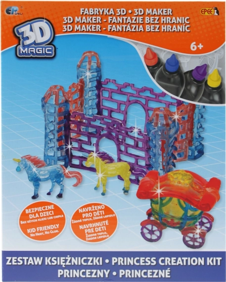 Cu 3D MagiDeluxe creezi ușor modele 3D originale – de la castele la calești sau personaje magice. Folosește gelul 3D Magic, alege o matriță sau un șablon și lasă creația să se întărească la lumina UV. Rezultatul este solid, colorat și pregătit pentru joacă sau expunere.