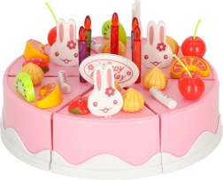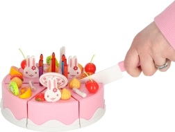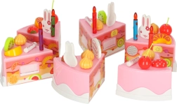 Descoperiți farmecul unei aniversări în fiecare zi. Tortul roz pentru copii din 6 felii, cu inscripția „Happy Birthday”, poate fi ușor demontat și reasamblat datorită benzii cu scai. Micii bucătari îl decorează după chef – cu lumânări, iepurași și fructe colorate – și îl servesc pe farfurii.