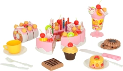 Pe lângă tort, setul include biscuiți, rulouri, brioșă, cupă pentru înghețată și ustensile – totul pentru un joc realist de petrecere.