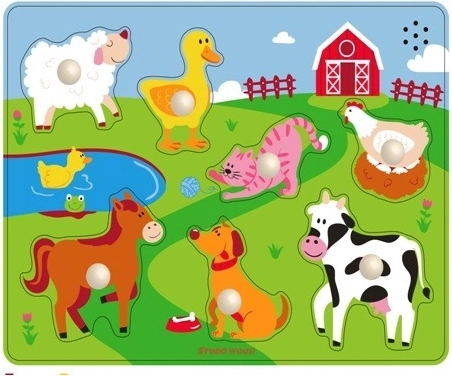 Jocul ajută la extinderea vocabularului – copiii învață în timpul jocului să denumească animalele (văcuță, oiță, căluț, găinușă etc.) și să observe culorile și formele. Execuția din lemn de calitate a mărcii STUDO WOOD este rezistentă și sigură pentru mâinile mici ale copiilor.