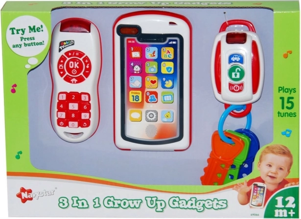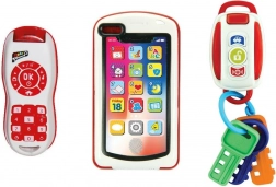 Primul meu set 3 în 1 este un kit educativ și distractiv pentru copii, incluzând chei de mașină, un telefon și un controler. Este perfect pentru a stimula imaginația și creativitatea copiilor. Acest set combina funcționalitatea cu distracția, oferind un număr variat de sunete și lumini.
