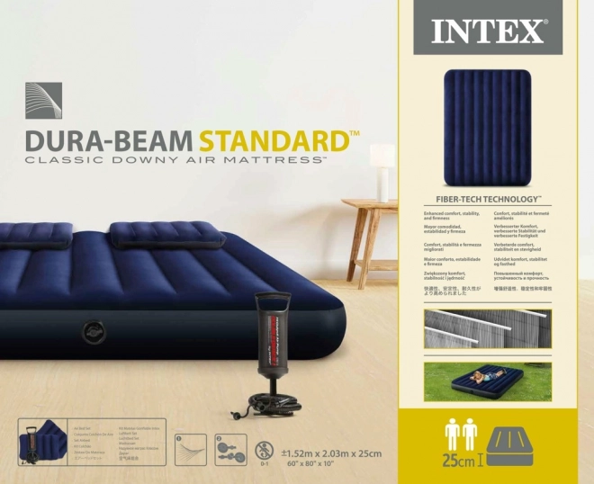 Practică saltea gonflabilă INTEX pentru două persoane, cu dimensiuni de 203 × 152 × 25 cm, suprafață catifelată din velur și construcție stabilă pentru un somn confortabil acasă sau în călătorii. Pachetul include pompă manuală cu piston, 2 perne gonflabile și petic de reparare. Datorită valvei Boston, umflarea și dezumflarea sunt rapide și ușoare.