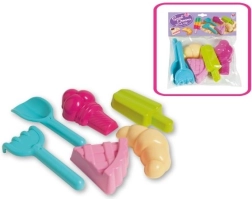 Set distractiv pentru nisip pentru micii cofetari. Cu aceste forme, copiii pot crea tortulețe, înghețată pe băț și înghețată la cupă, precum și alte bunătăți. Sunt incluse și o lopățică și o greblă pentru modelare ușoară. Plastic ușor, manevrare simplă și mix de culori pentru ore întregi de joacă creativă în parc sau pe plajă.