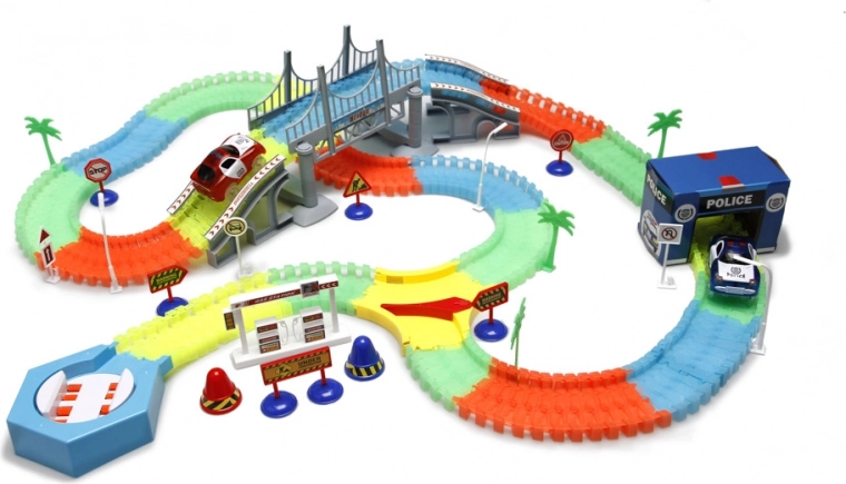 Pista luminoasă cu 220 de piese flexibile aduce construcție creativă și curse palpitante chiar și pe întuneric. Piesele se clipsează simplu între ele, creând linii drepte, curbe și poduri, iar traseul se poate schimba în câteva clipe.