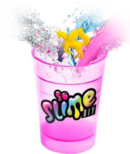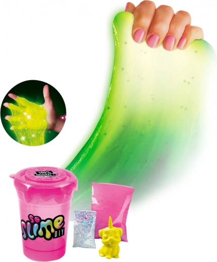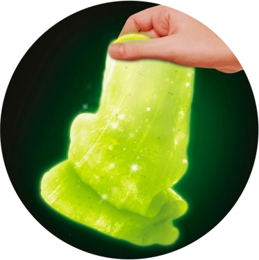 Creează-ți propriul slime. Toarnă praful în pahar, adaugă sclipici și o figurină. Completează cu apă până la marcaj, închide paharul și agită bine amestecul. Apoi deschide paharul și așteaptă cinci minute. Slime-ul este gata. Combină culorile, adaugă sclipici și bucură-te de distracția adevărată cu slime. Strălucește în întuneric. Pentru copii de la 6 ani.