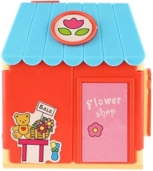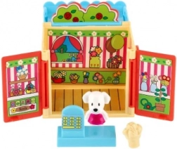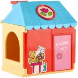 O căsuță veselă cu motive florale și casă de marcat îi învață pe copii să combine culorile, să aranjeze și să aibă grijă de clienți.