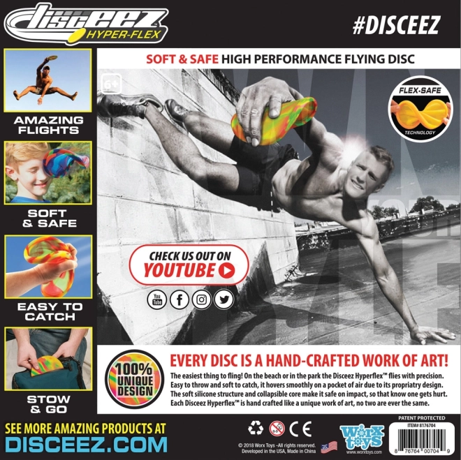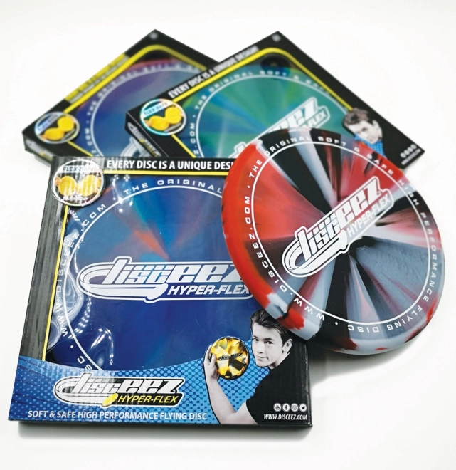 Discul zburător DISCEEZ Hyper-Flex cu diametrul de 20,5 cm este conceput pentru distracție maximă și siguranță. Este realizat din material moale și flexibil, care asigură un zbor stabil și o prindere confortabilă, fără lovituri dureroase. Datorită modelelor și culorilor atrăgătoare, va fi îndrăgit pe loc atât de copii, cât și de adulți.