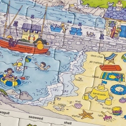 Descoperiți ce se poate găsi pe plajă și învățați să numiți sporturile acvatice prin intermediul acestui puzzle distractiv. Fiecare piesă reprezintă un cuvânt diferit care trebuie asociat cu imaginea corectă de pe marginea puzzle-ului. Puzzle-ul conține 18 piese în centru, care formează o scenă completă cu cuvinte educaționale în engleză. Copiii pot căuta cuvintele în imagine pentru o mai bună înțelegere.