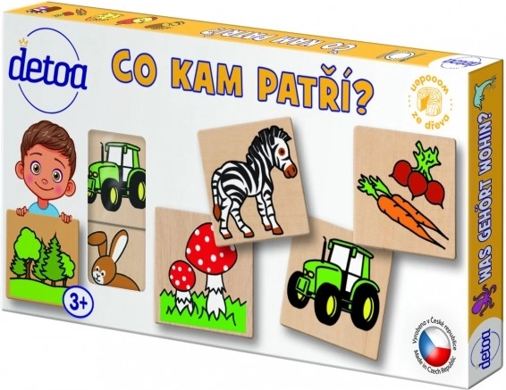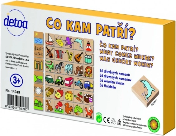 Puzzle din lemn Detoa Ce unde aparține este un joc didactic care ajută copiii să recunoască obiectele și să le asocieze cu imaginea corectă. Acest joc este ideal pentru îmbunătățirea gândirii logice și a memoriei la copiii cu vârsta de peste 3 ani.