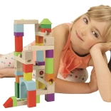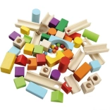 Setul de blocuri din lemn colorate și căi permite posibilități infinite de construire a pistei, dezvoltând motricitatea fină și creativitatea.