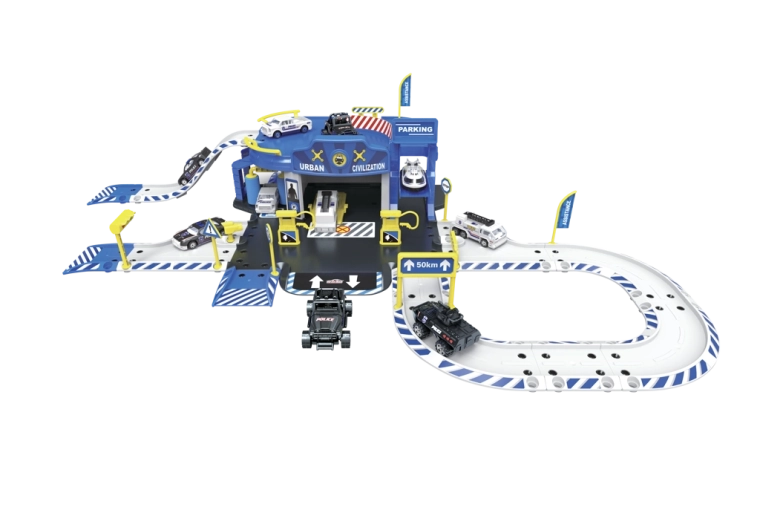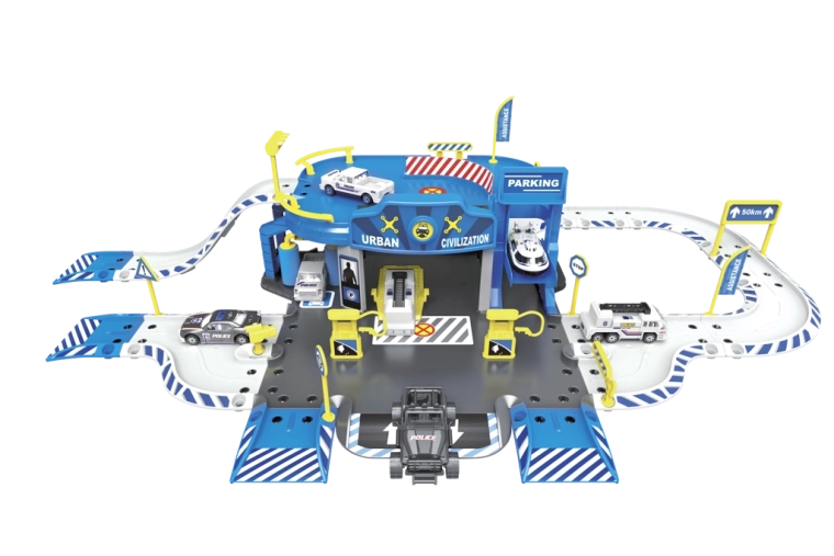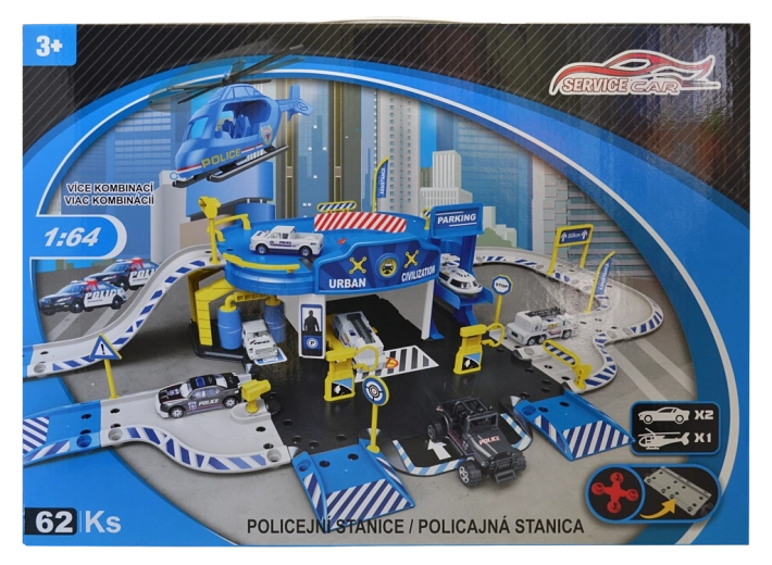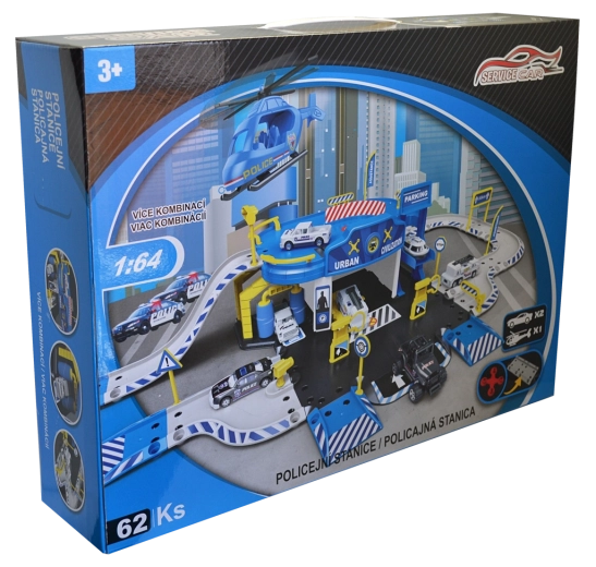 Stație de poliție cu garaj cu accesorii (set de 62 piese) Dimensiuni garajului după asamblare: 83,2 × 45,2 × 20 cm Conținutul setului: stație de poliție cu garaj, model de mașinuță metalică 1:64 (6 buc) și elicopter