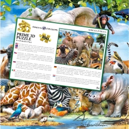 Descoperiți lumea fascinantă a asamblării cu puzzle-ul 3D Zâmbet african. Tiparul lenticular special creează un efect optic 3D pronunțat, care oferă o senzație realistă de profunzime și dă viață motivului faunei africane. Imaginea finală devine o frumoasă decorațiune pentru camera copilului și, în același timp, dezvoltă răbdarea, concentrarea și motricitatea fină.