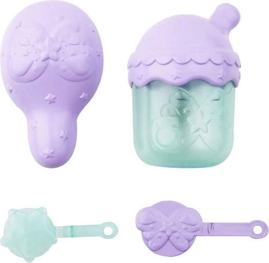 Pachetul include 9 accesorii tematice, cu care te vei distra pe săturate: biberon pentru hrănire, pieptene, aripi curcubeu, cleme, autocolante, pandantiv și certificat de adopție. Sunt disponibile 3 variante de culoare (alb, roz, albastru), astfel încât fiecare mic vrăjitor sau mică vrăjitoare își poate alege preferata.