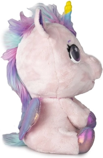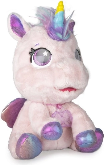Ponei de pluș interactiv, care va deveni cel mai îndrăgit prieten al tău. Răspunde la atingeri și îngrijire cu peste 30 de sunete și acțiuni – de la nechezat vesel până la fredonări blânde. Datorită transformării treptate în trei etape magice, vei observa cum îi crește cornul colorat și cum poneiul devine un unicorn minunat.